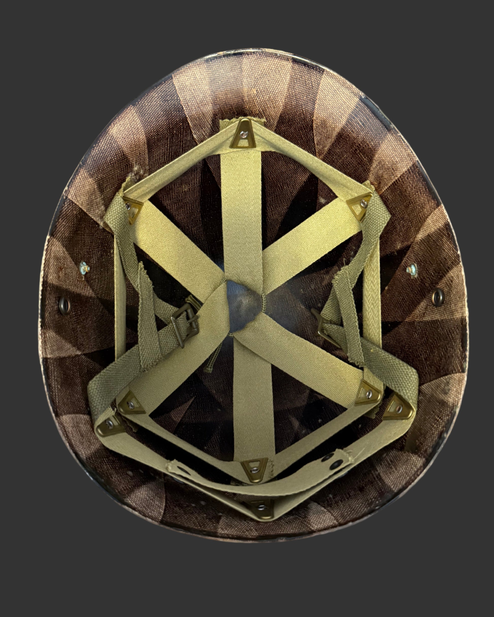 An American WWII period M1 Helmet. Swivel bales and rear seam construction. Helmet liner stamp is faint but appears to be Westinghouse.