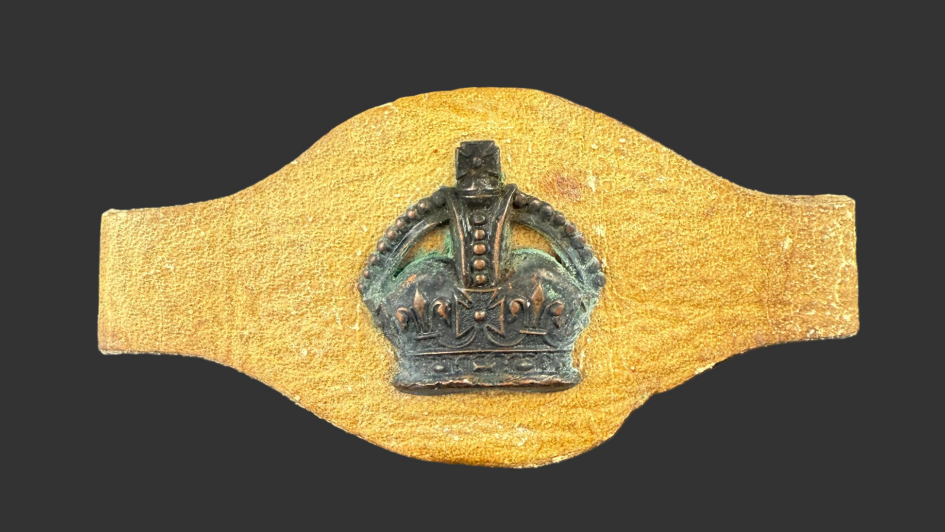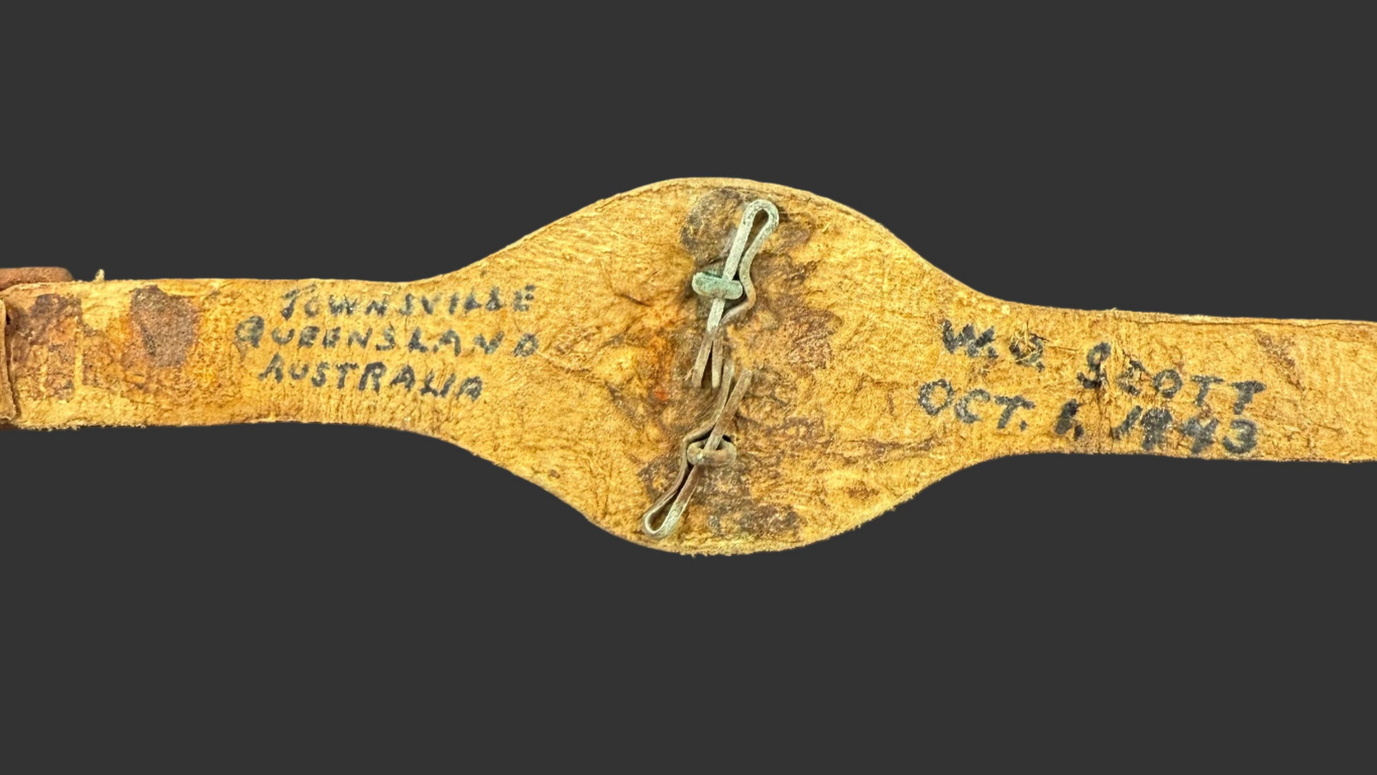 WWII Australian Warrant Officer rank wrist strap. Leather construction with a brass King's Crown WO rank insignia attached. The interior is marked in ink: W.O. Scott - Oct 1943 / Townsville / Queensland / Australia.