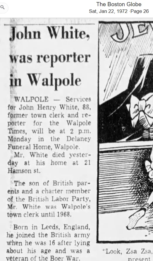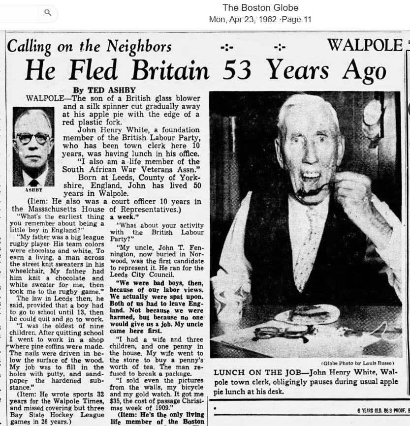 John Henry White was born in Leeds, Yorkshire. He joined the army underage at 16 to fight in the Boer War and served in the 109th Company of the Yorkshire Imperial Yeomanry. He and his family were early members of the Labour Party in the UK. Struggling to find employment as a result of their political activism, they fled Britain in 1909 and settled in Walpole, Massachusetts, USA. White worked as the town clerk of Walpole for many years and was a life member of the South African War Veterans' Association.
