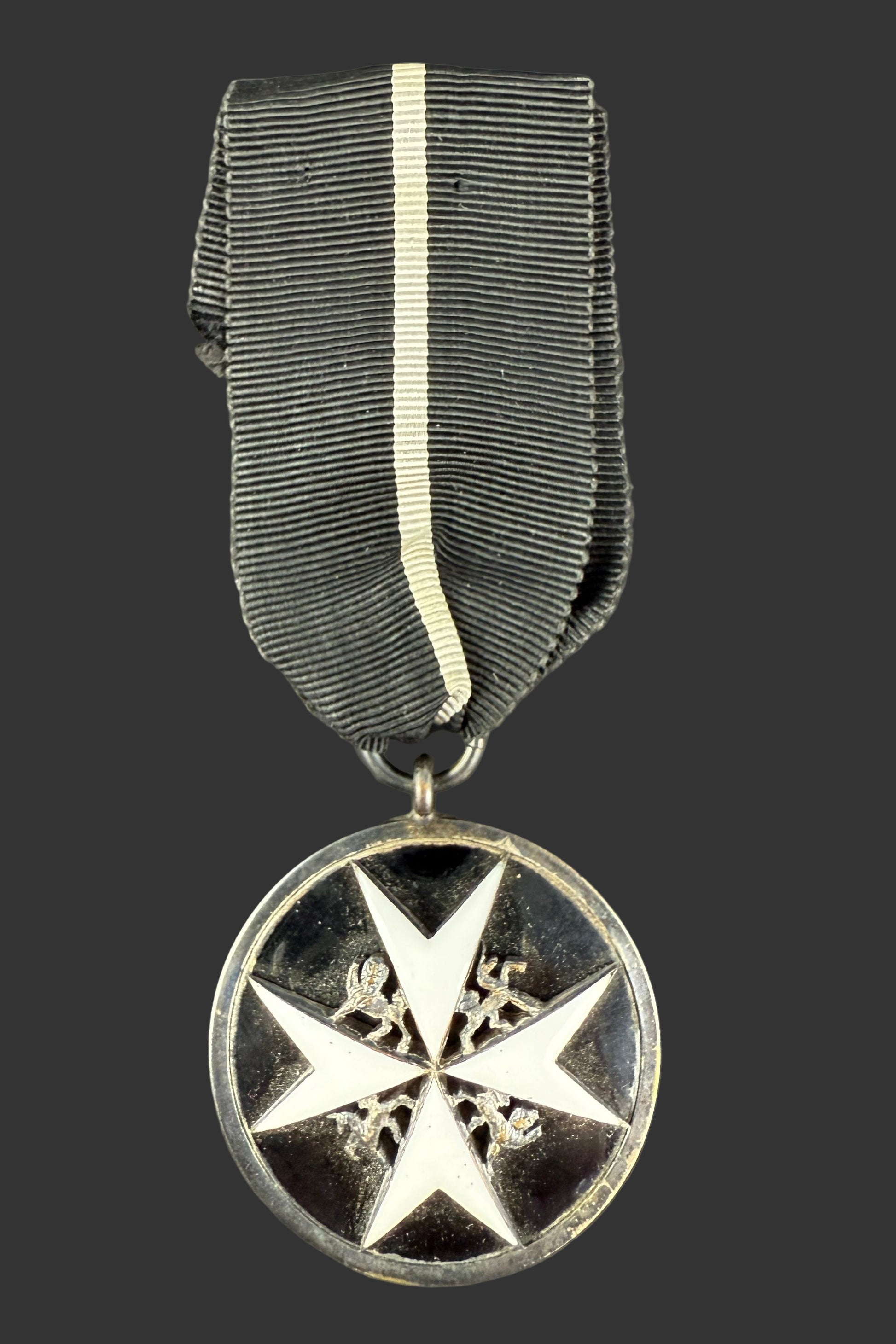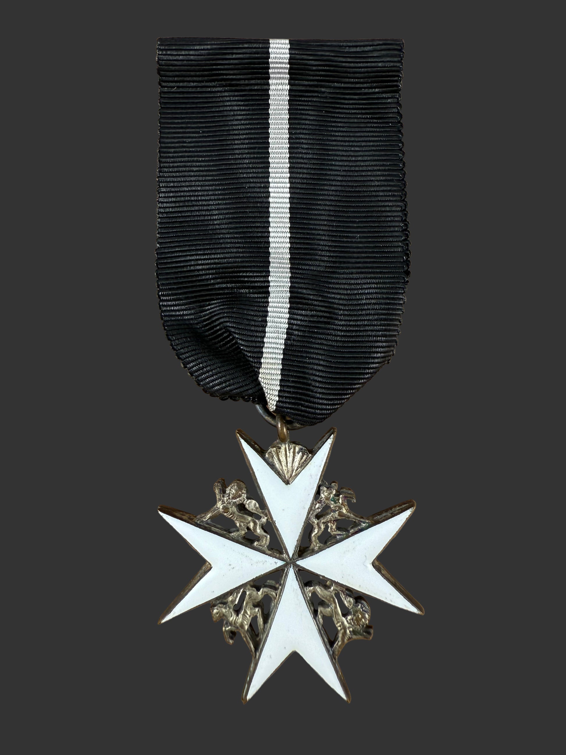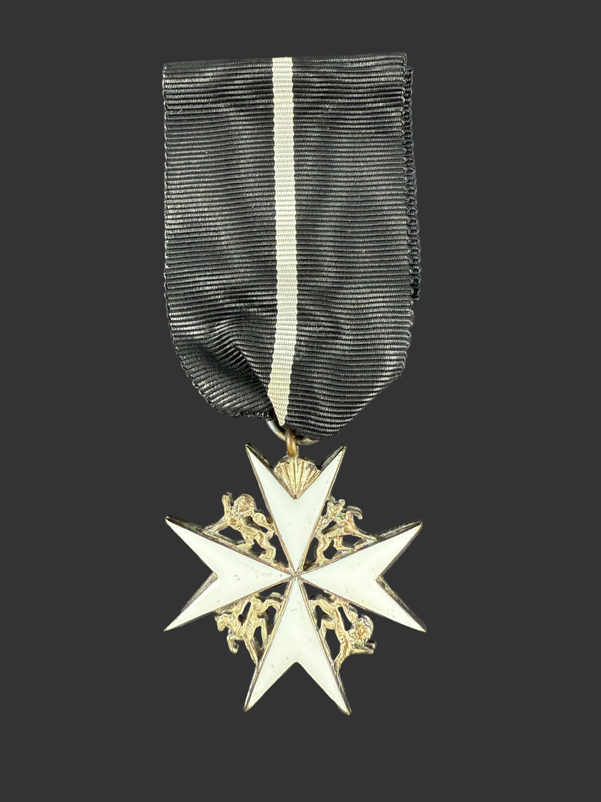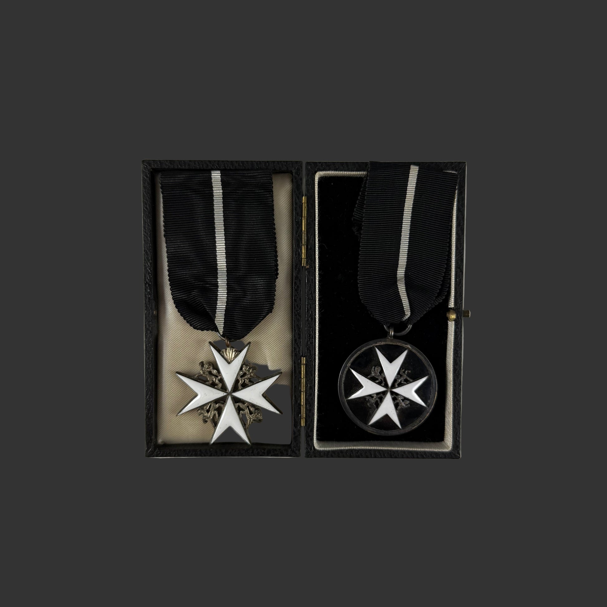 A set of 2 insignia of the Venerable Order of Saint John - Officer and Serving Brother. On original black silk ribbons with a central white stripe - formerly used for recipients who were not members of the Christian faith. Accompanying the insignia is a document from the Priory of Canada with the address: St. John House, 321 Chapel Street, Ottawa 2, Ontario. The medals are contained in the original award case. Beautiful multi-piece construction in silver and enamel. All in excellent condition and quite scarce with the ribbon awarded to non-Christian members of the order.