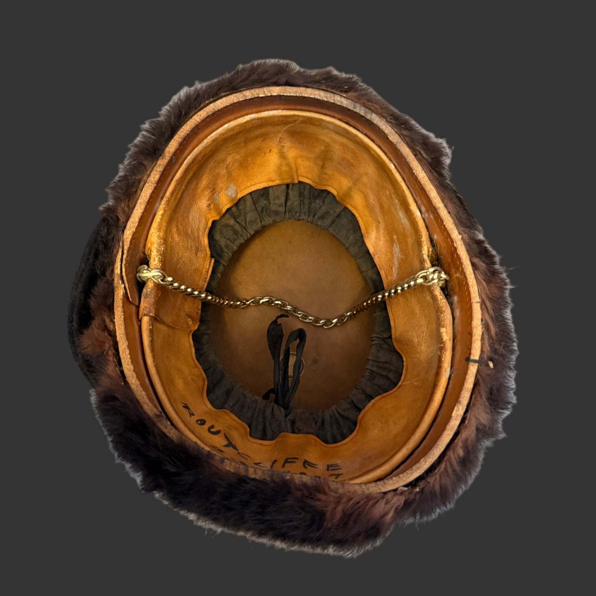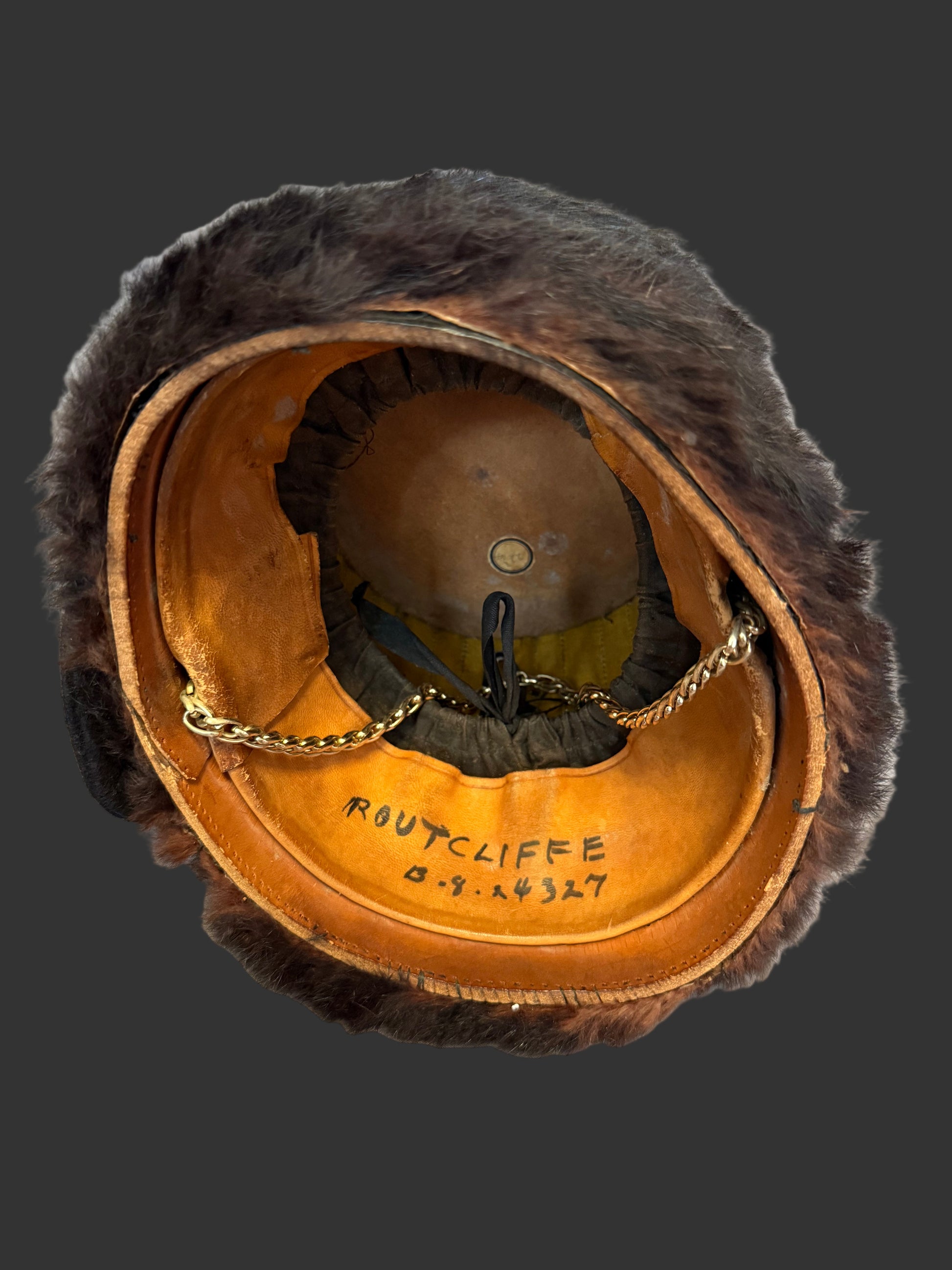 A WWII or post-war period Royal Corps of Signals / RCCS busby as worn by members of the corps band. Chin chain appears to be a later replacement. Named to Routcliffe but unresearched.