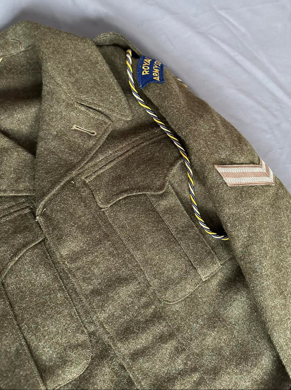 P1949 Canadian Battle Dress Uniform. Dated 1952. Badged to RCASC with shoulder titles, qualification badge, rank badges and lanyard. Size. Pants are size 7 and dated 1953.