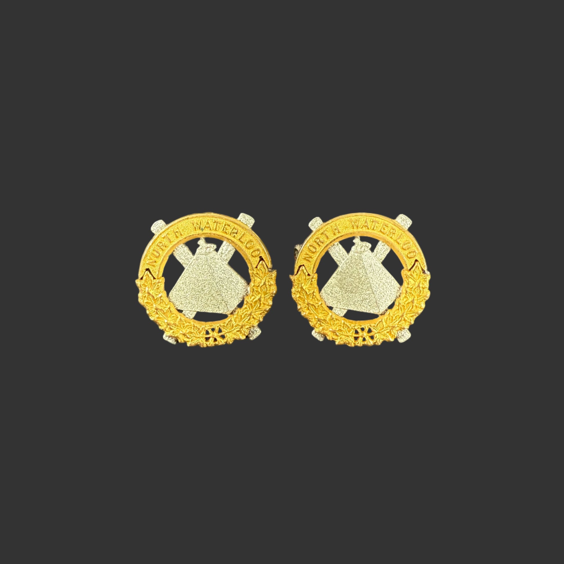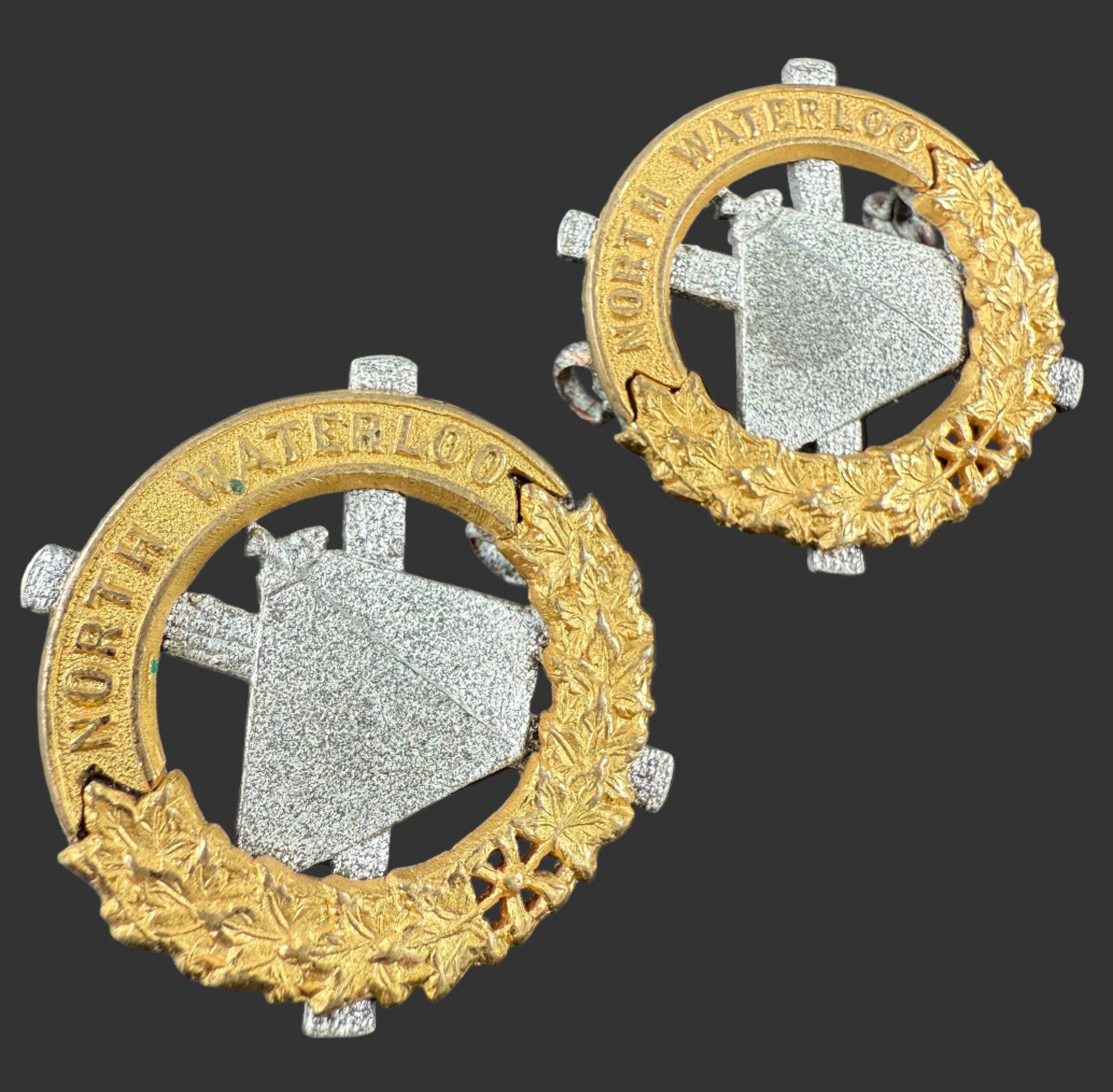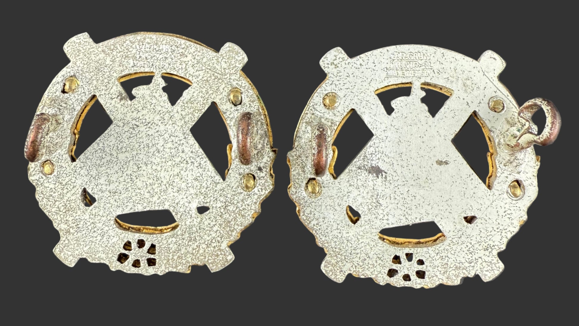 A fine pair of 1930s/WWII era officers' collar badges for the North Waterloo Regiment, also later worn by the Scots Fusiliers of Canada. Two lugs to reverse. Reverse marked: J. R. Gaunt - Montreal - Made in England.