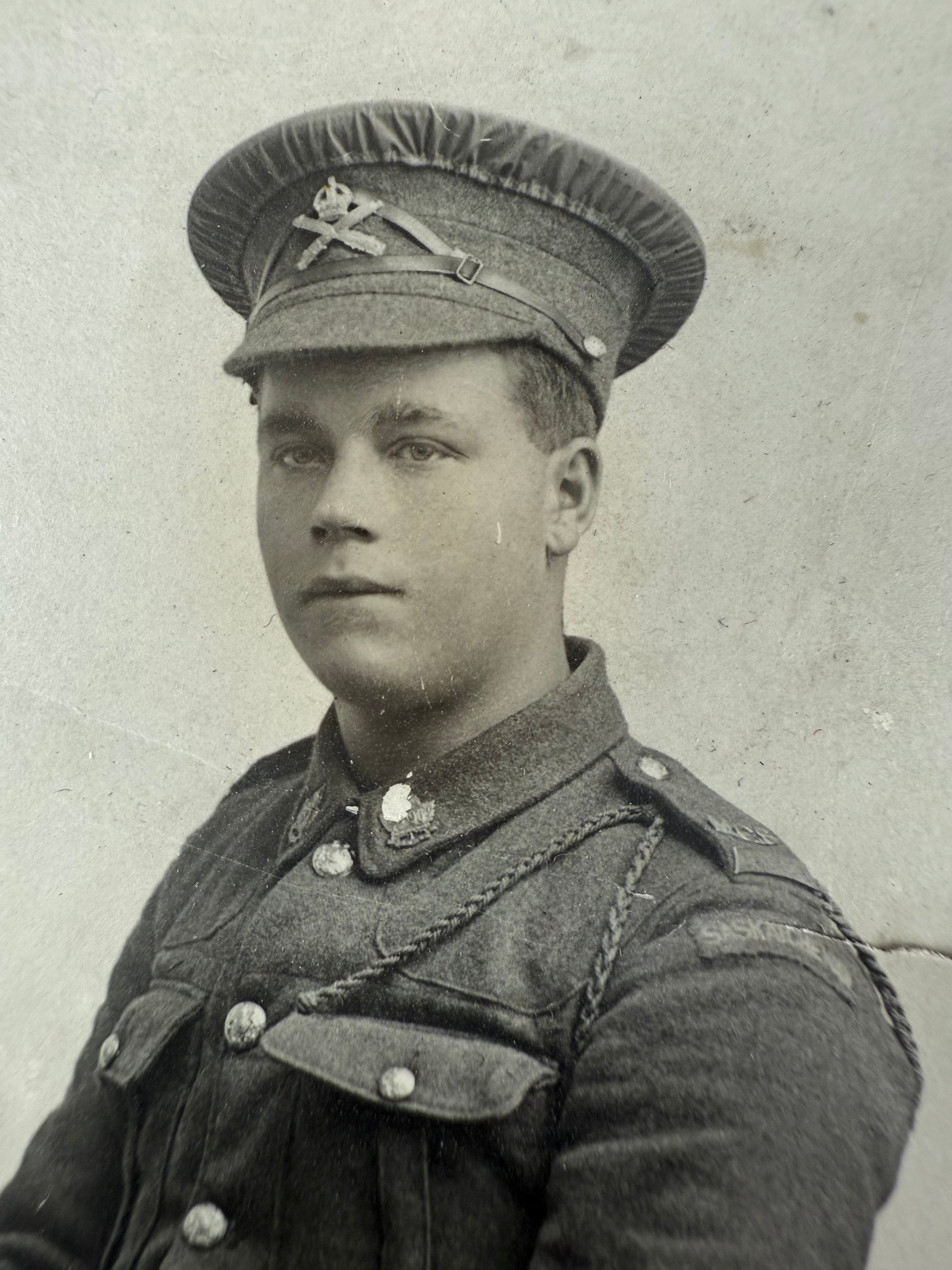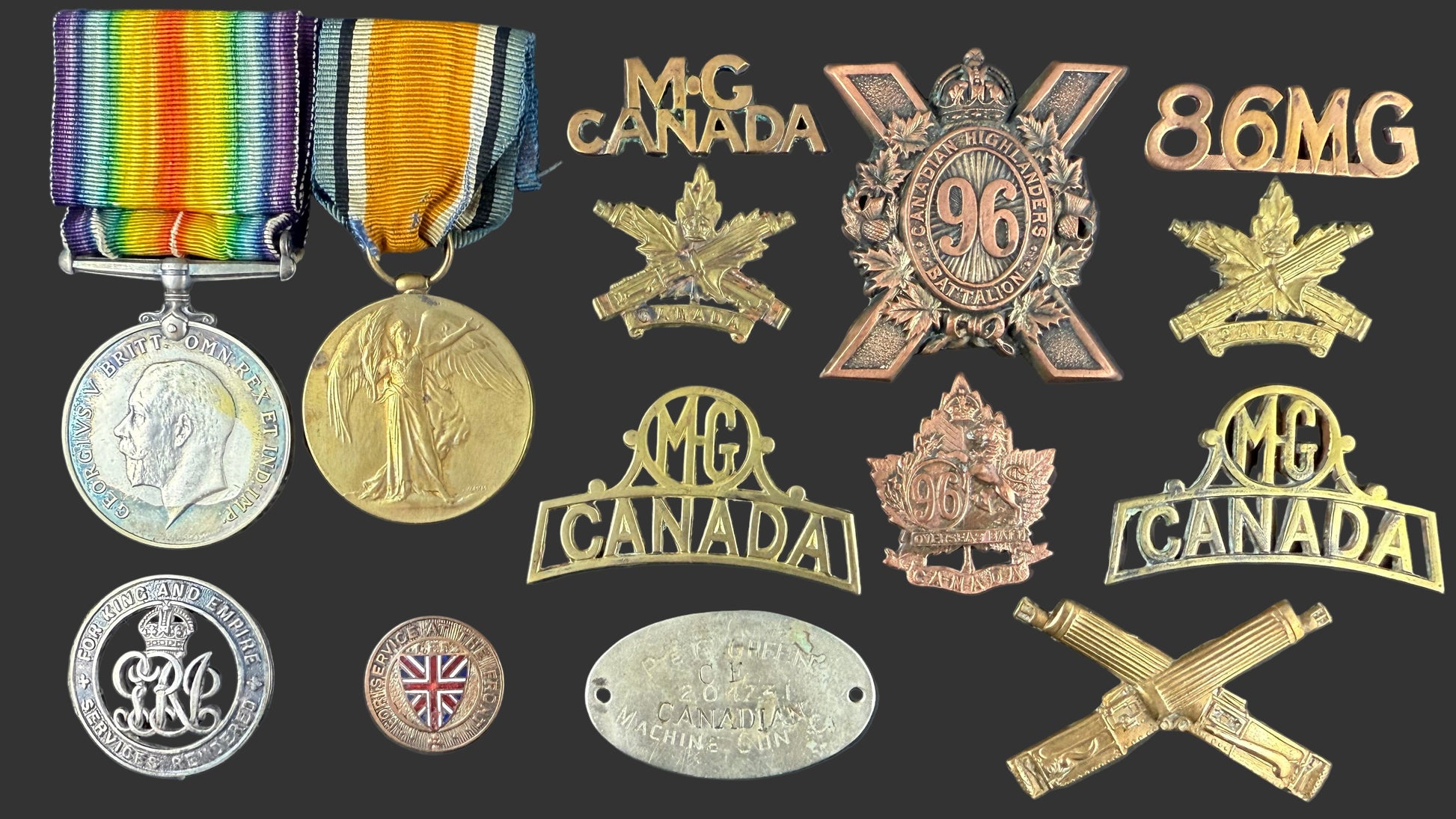 Charles Green was born in Topeka, Kansas, USA. He was working as a farmer and living in Strassburg, Saskatchewan when he joined the 96th Battalion (Canadian Highlanders) in November, 1915. In England he was transferred initially to the 92nd Battalion (48th Highlanders) but later to the 14th Canadian Machine Gun Company, joining that unit in France in April, 1917. In late July, 1917 Green was wounded (GSW buttock) and invalided to England. He had a surgery to remove the bullet lodged in his pelvis. Still experiencing significant pain and loss of movement, he was eventually medically discharged from the CEF in March, 1918. His WWI pair is sold with his Class A War Service Badge, Class B War Service Badge (WSB), an engraved ID bracelet, various original badges and insignia and a photo of him. In the photo he can be seen wearing the early “MGS” collar titles as well as rare “Saskatchewan” cloth shoulder titles. This group was found framed. Unfortunately a previous owner, likely the family, removed all the lugs/attachment fittings from the badges/insignia.