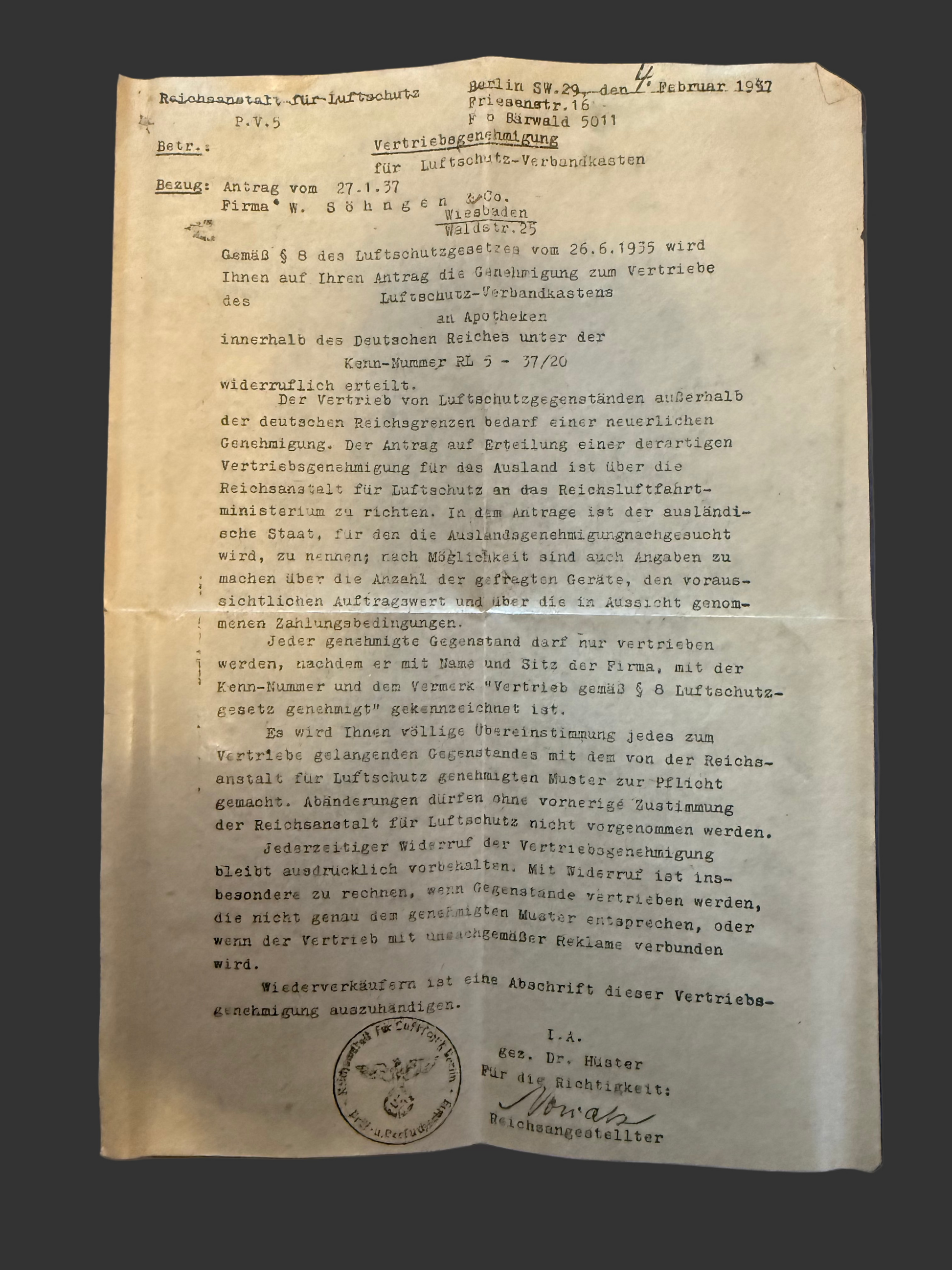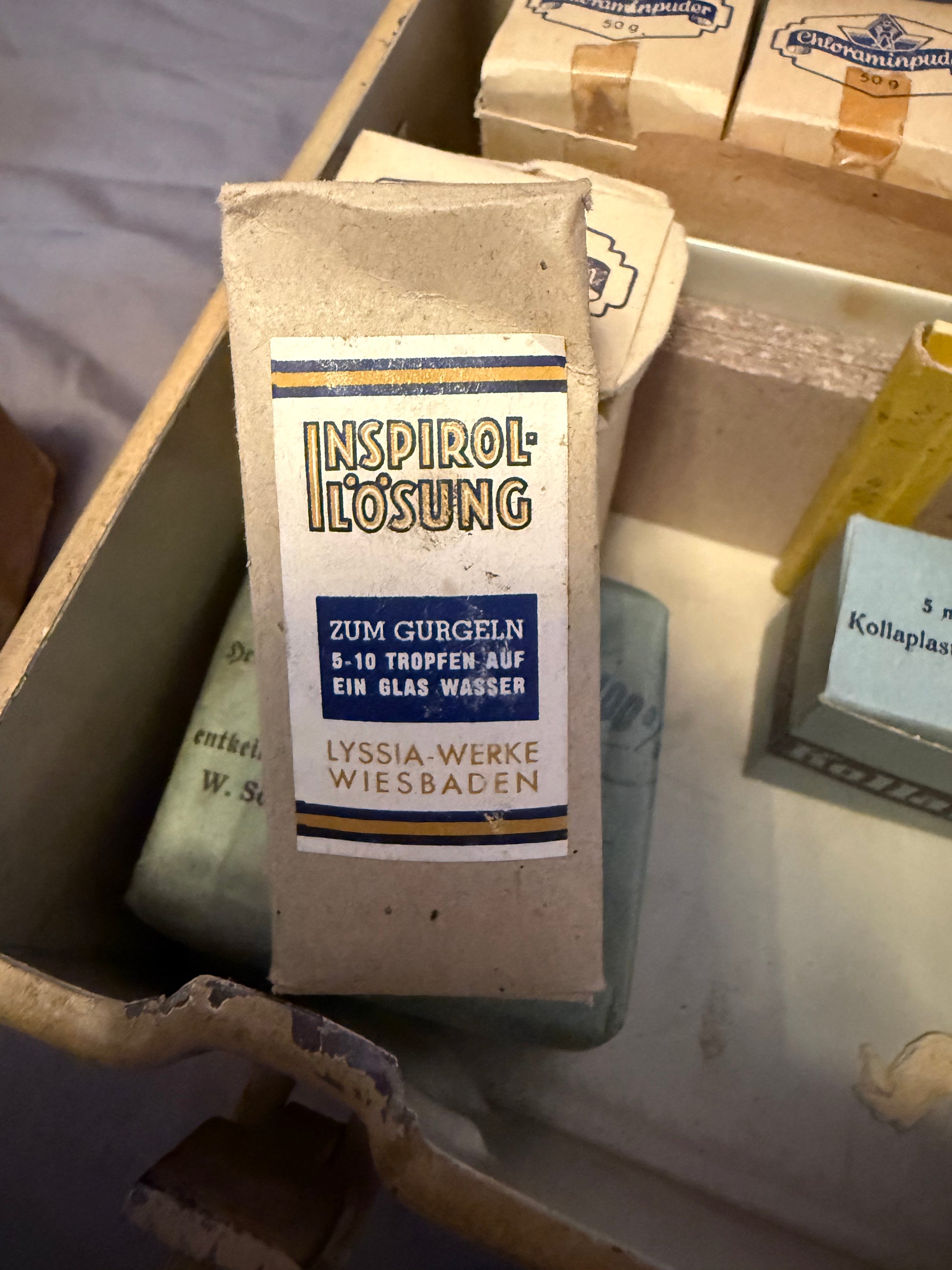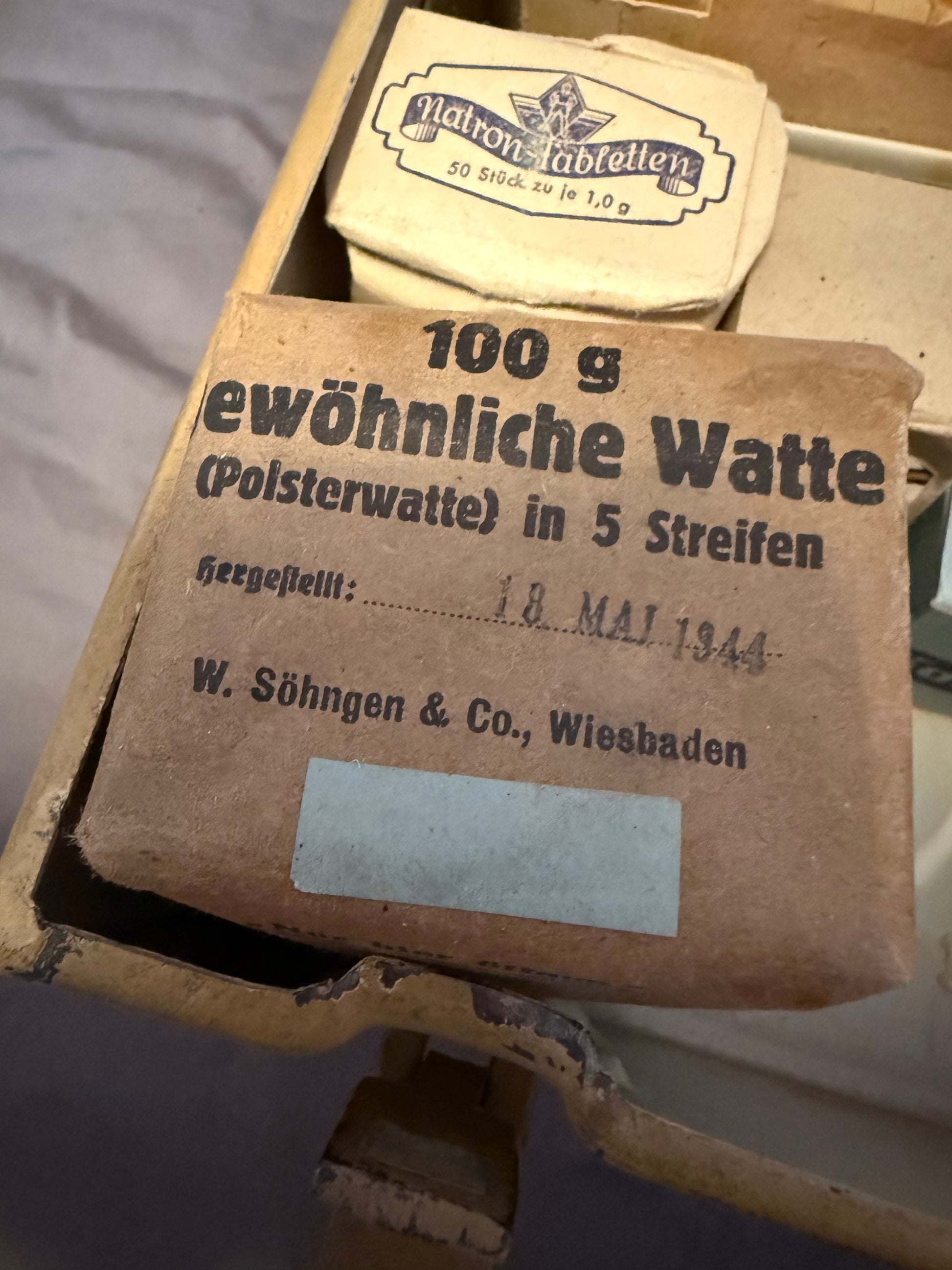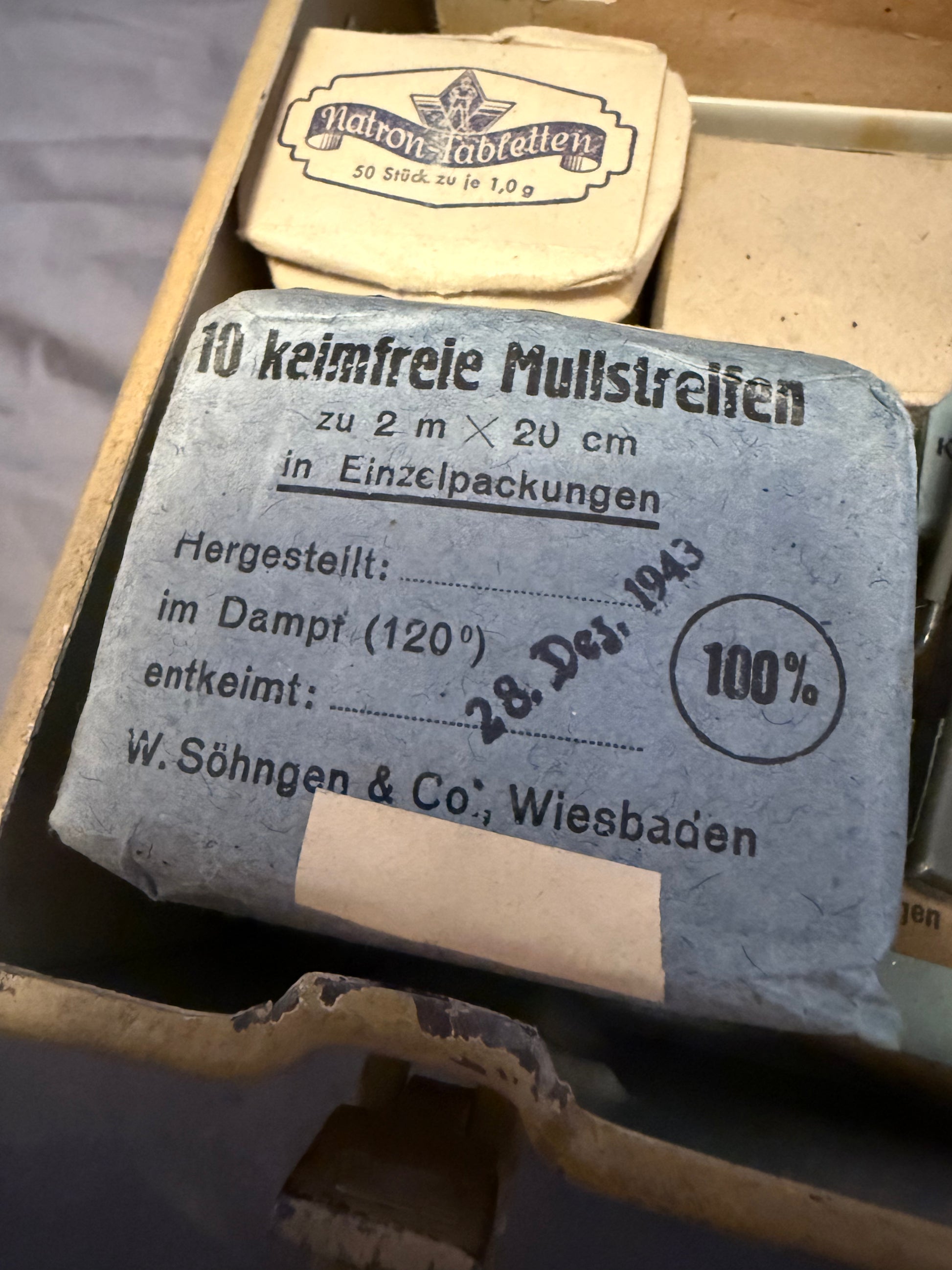 WWII German Luftschutz Verbandkasten - complete with contents. A very nice example of a Third Reich period air defence first aid kit. Contained in a sturdy steel box, the kit has an amazing assortment of original (most pre-war or wartime dated) medical supplies including a splint, various salves and medications, bandages, gauze, scissors, etc. Also has an original stamped document. Appears to have come out of the Wiesbaden area. This example is the scarcer ordnance tan version, most were painted in the standard German field grey. Very difficult to find with complete contents.