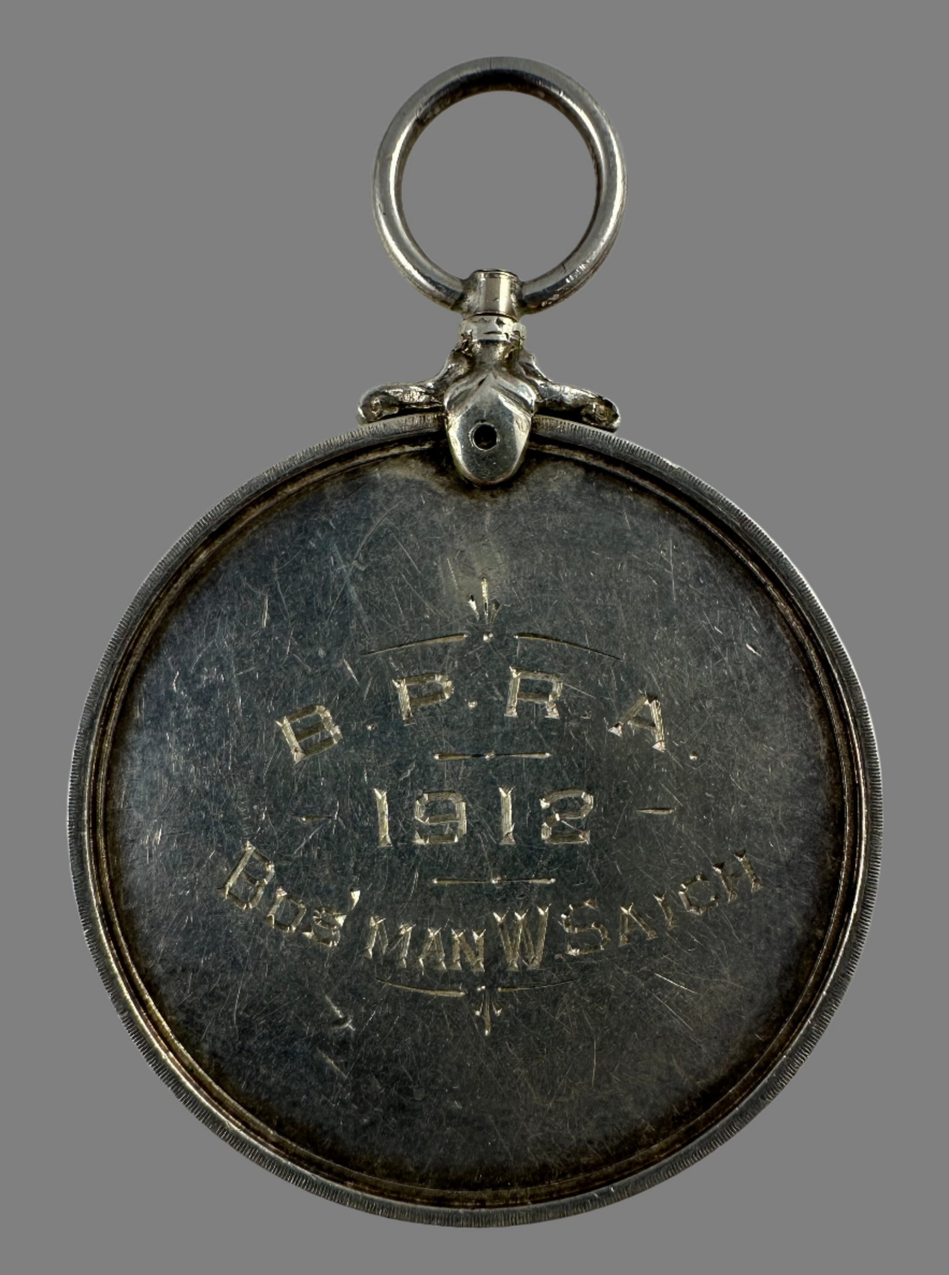 A silver shooting medal, the obverse featuring the insignia of the Royal Sussex Regiment, the reverse engraved: B. P. R. A. - 1912 - BDS'MAN W. SAICH