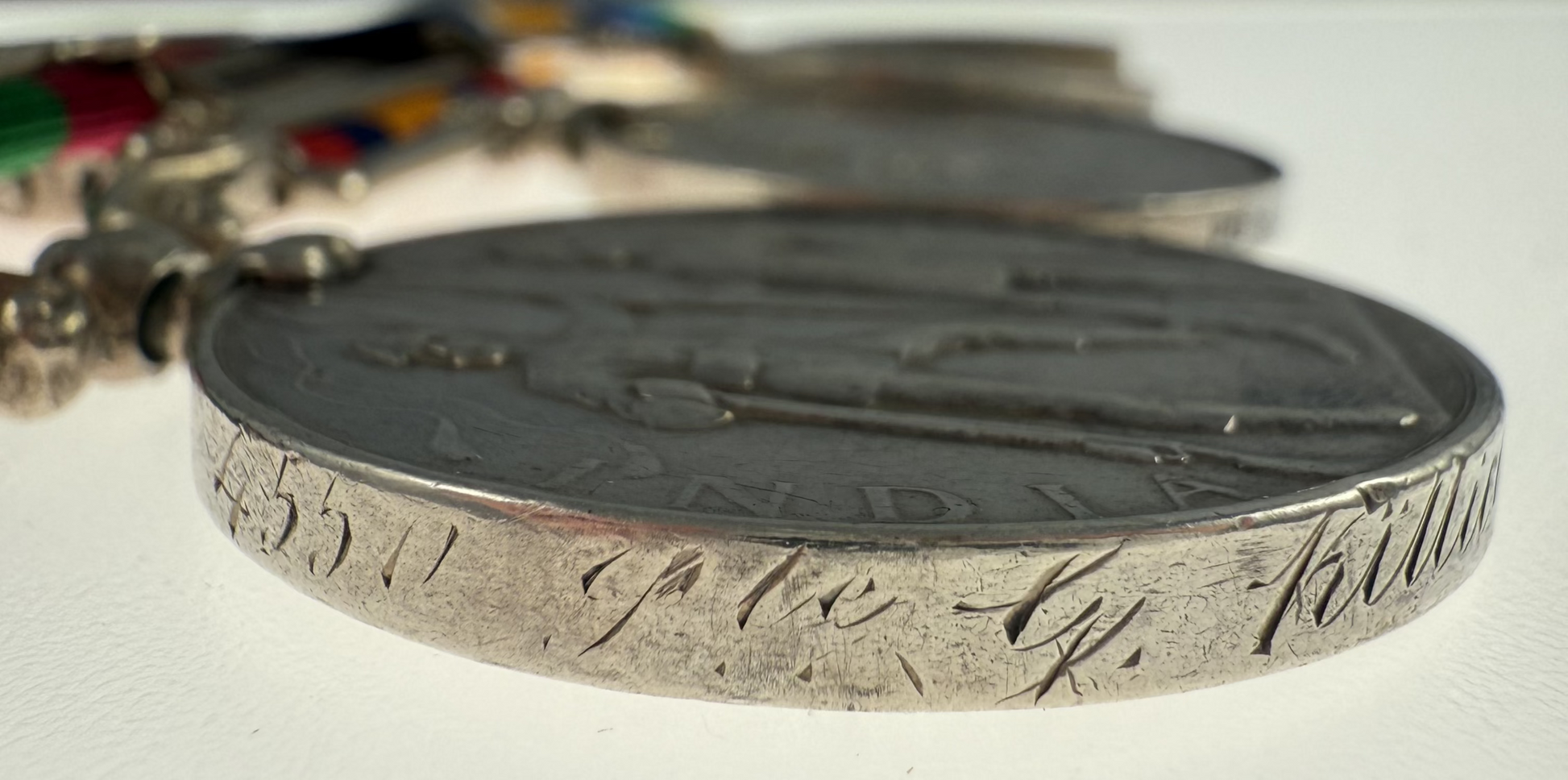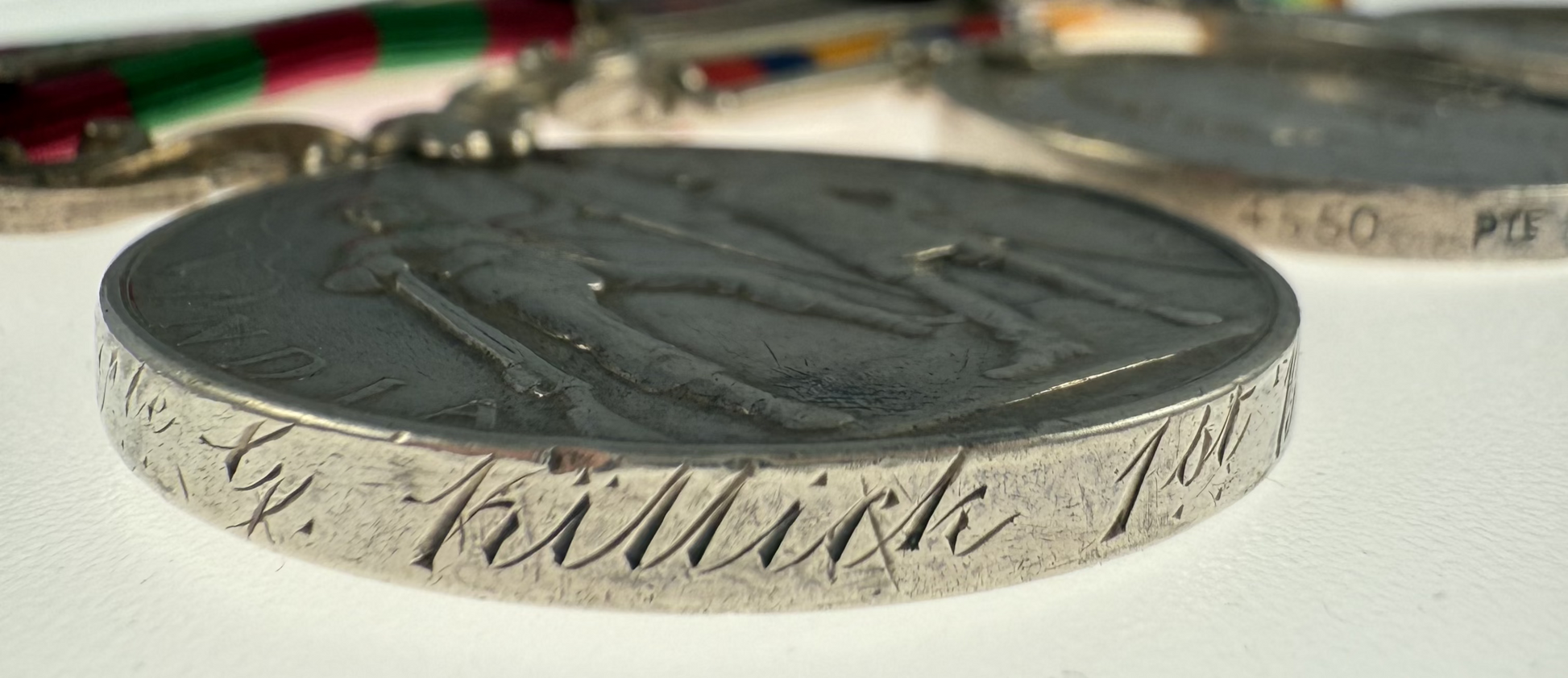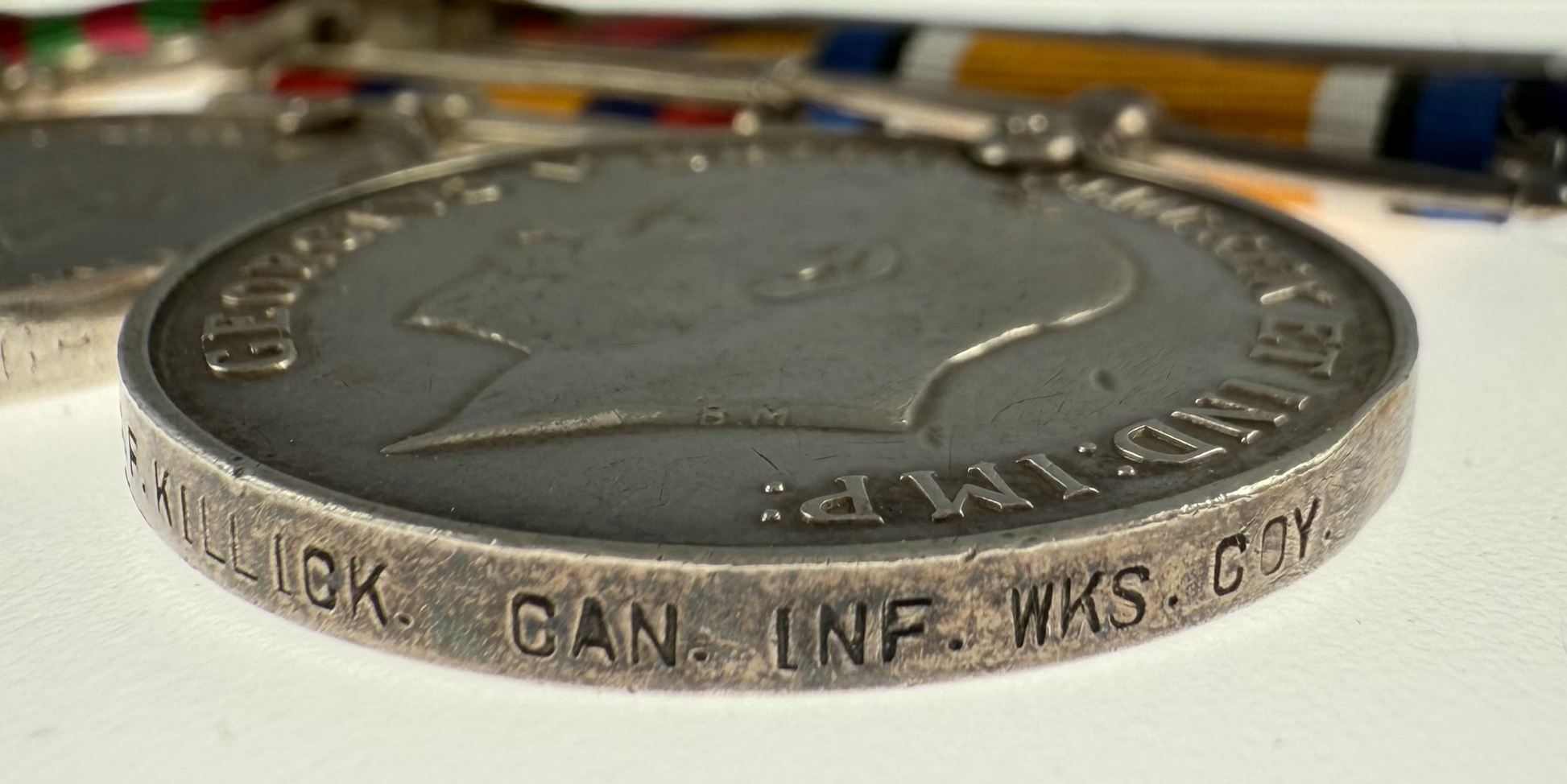 India General Service medal with clasps: "Punjab Frontier 1887-98" and "Tirah 1897-98" named: 4550 Pte. G. Killick. 1st Bn. Gord. H.; Queen's South Africa Medal bars "Cape Colony", "Paardeberg", "Driefontein" named: 4550 PTE. G. KILLOCK. GORDON. HIGHRS.; BWM, VM named: 814134 L. CPL. G. F. KILLICK. CAN. INF. WKS. COY. Naming a bit rubbed in parts.