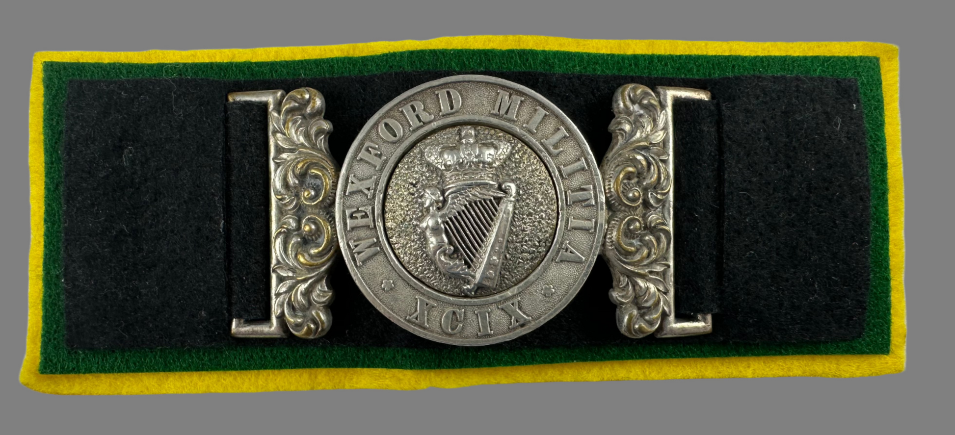 A pre-1881 Victorian Buckle from the 99th Wexford Militia. Silver plated brass. Mounted for display on felt. A rare piece.