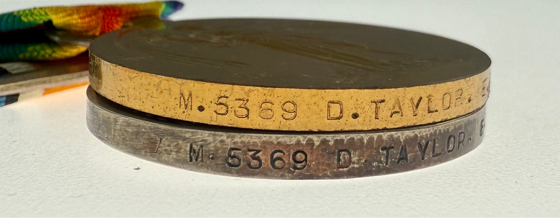 David Taylor was born in Dundee, Forfarshire, Scotland in 1891. He joined the Royal Navy in 1912. He served in HMS J5 and was discharged dead from the boat in November 1918, having died of pneumonia. He is buried in Barnhill Cemetery, near Dundee. Sold with the (crushed) transmittal boxes for the 1914-15 Star and the BWM/VM.