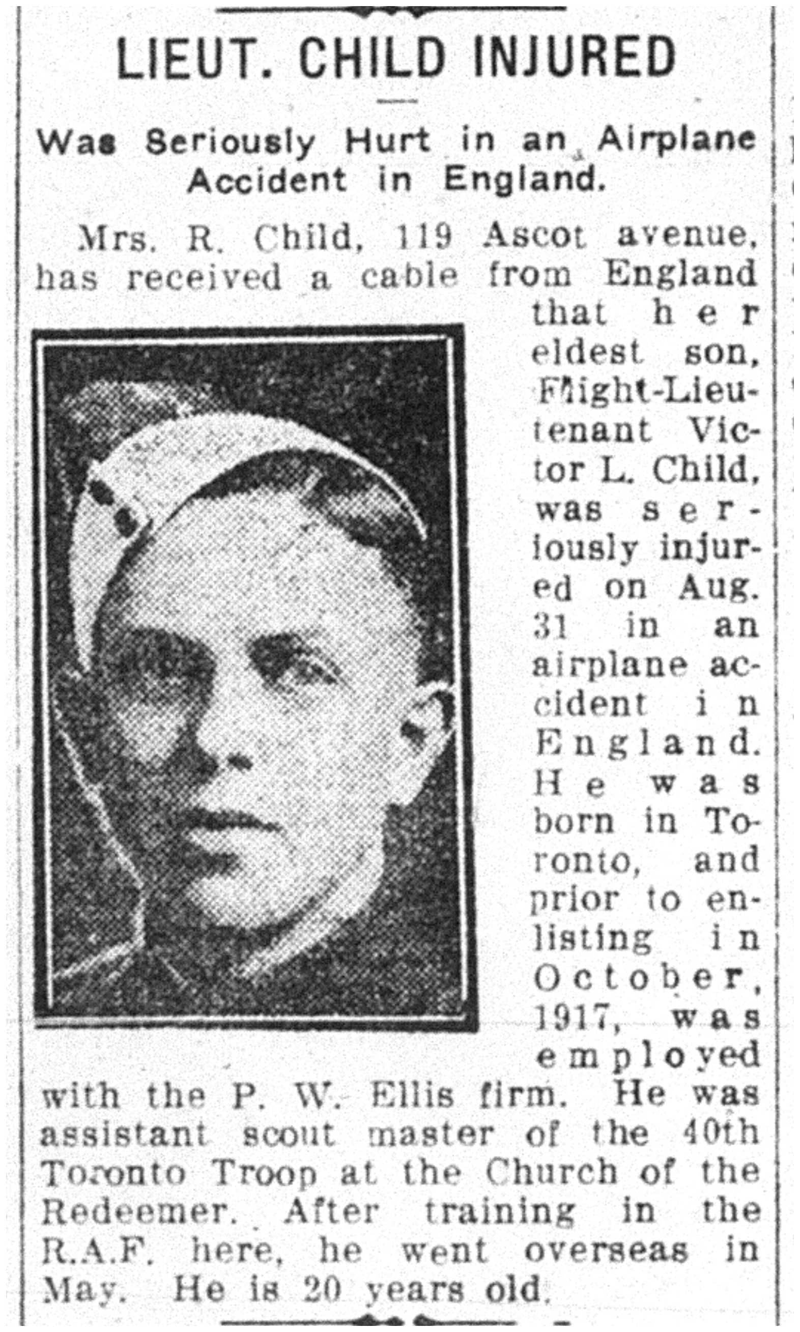 Victor Llewellyn Child was born in Palmerston, Ontario and joined the Royal Flying Corps in 1917 undergoing pilot training in Canada before proceeding to the UK. He was seriously injured in an aeroplane accident in England in August, 1918 while flying with 28(T) Squadron, RAF. Due to his injuries, he did not see service outside the UK during the war. Prior to joining the RAF, Child worked for the P. W. Ellis firm, famous for it's WWI badges. After his service, Child became a noted artist. A full biography can be found on Wikipedia: