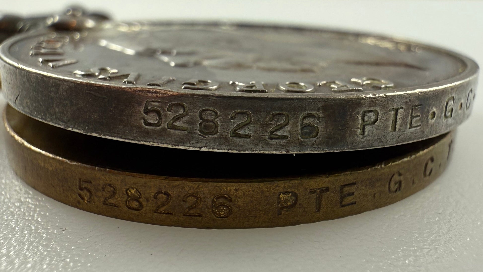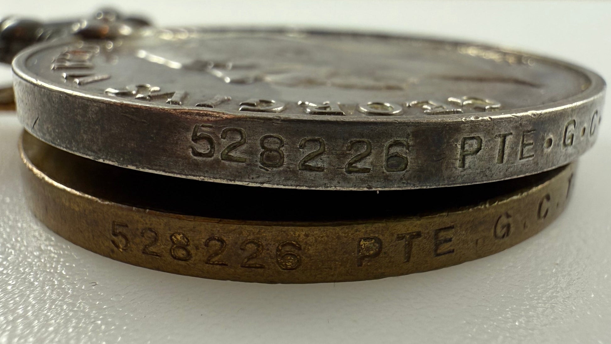 British War Medal, Victory Medal named to: 528226 Pte. G.C.T. Thomas C.S.E.F.