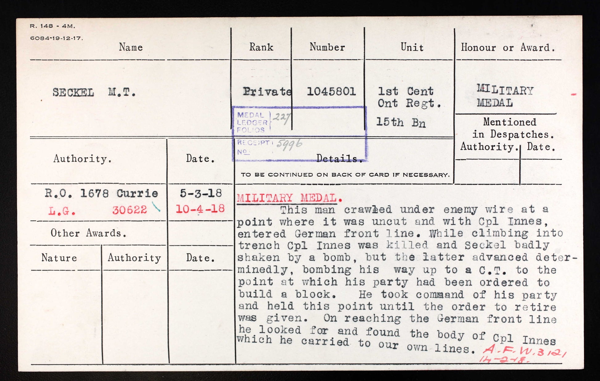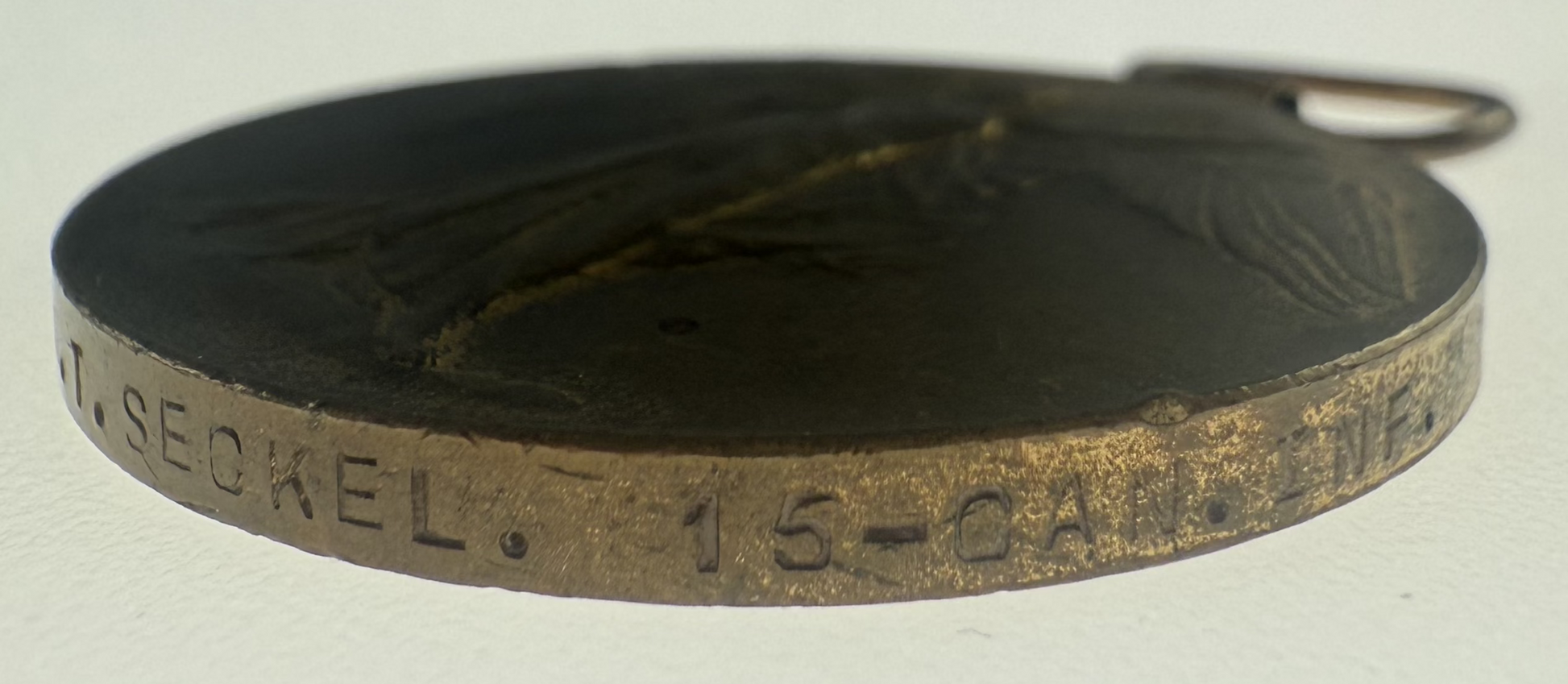 WWI Victory Medal named to: 1045801 A. SJT. M. T. SECKEL. 15-CAN. INF.